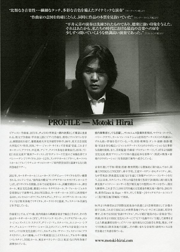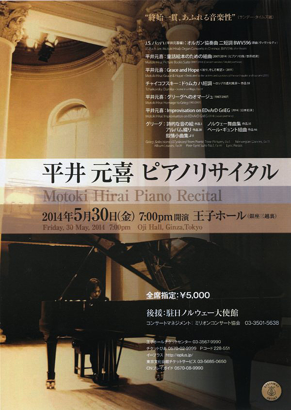 J.S.バッハ(平井元喜編)/オルガン協奏曲 ニ短調 BWV596(原曲:ヴィヴァルディ) 平井元喜/童話絵本のための組曲(2007/2014)[ピアノソロ版/世界初演] 平井元喜/Grace and Hope〈祈り、そして希望〉(2011) チャイコフスキー/ドゥムカ ハ短調 〜ロシアの農村風景〜 Op.59 平井元喜/グリーグへのオマージュ(1987/2007) 平井元喜/Improvisation on EDvArD GriEG(2014)[日本初演] グリーグ/詩的な音の絵 Op.3 ノルウェー舞曲集 Op.35 アルバム綴り Op.28 ペール・ギュント Op.46 叙情小曲集より |