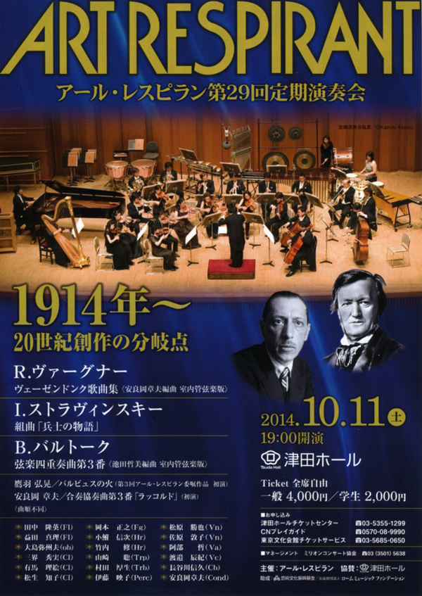 ヴァーグナー/ヴェーゼンドンク歌曲集(安良岡章夫編曲、室内管弦楽団版) ストラヴィンスキー/組曲「兵士の物語」 バルトーク/弦楽四重奏曲 第3番(池田哲美編曲、室内管弦楽団版) 鷹羽弘晃/バルビュスの火(第3回アール・レスピラン委嘱作品・初演) 安良岡章夫/合奏協奏曲 第3番「ラッコルド」(初演)〈曲順不同〉 |