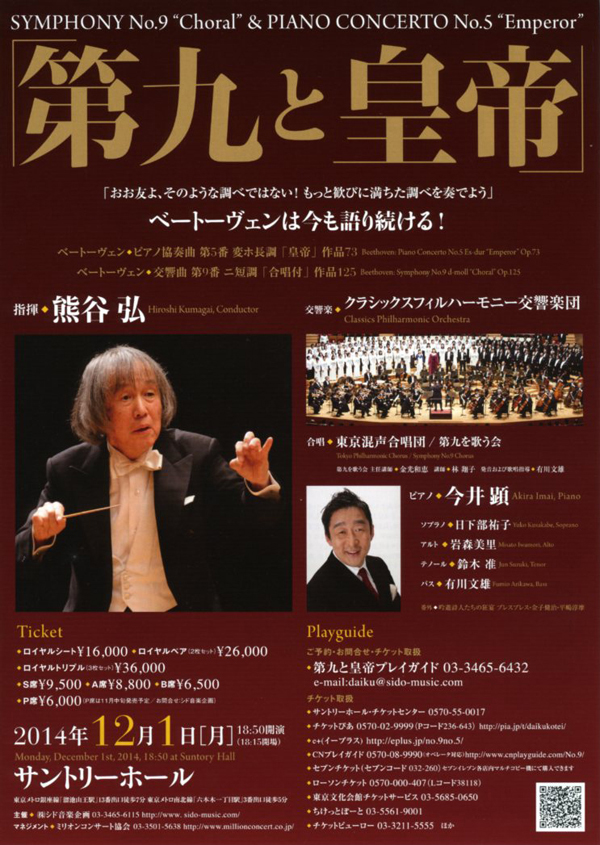 一般社会との関わりを大切にしながらコンサートのあり方を追求してきた指揮者 熊谷 弘の理念に基づき、「第九と皇帝」は1981年に開始。東響、新日本フィル、東京フィル等在京オーケストラの協力のもと、第9交響曲とピアノ協奏曲第5番「皇帝」との組み合わせで、交響楽ファンとピアノ音楽を愛する人々とが一堂に集い、多くの人々に親しまれて参りました。
