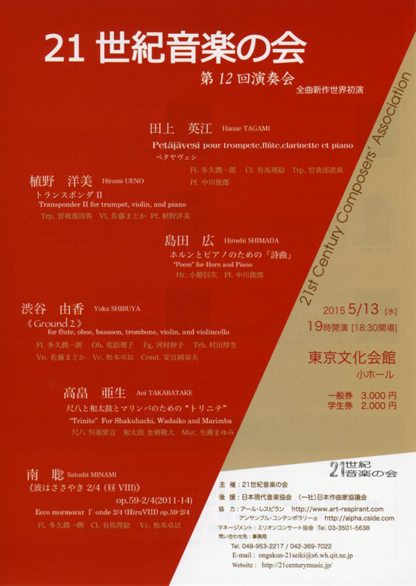 田上英江/Petäjävesi pour trompete,flûte,clarinette, et piano 植野洋美/トランスポンダ Ⅱ 島田 広/ホルンとピアノのための「詩曲」 渋谷由香/《Ground 2》for flute, oboe, bassoon, trombone, violin, and violincello 高畠亜生/尺八と和太鼓とマリンバのための“トリニテ” 南 聡/《波はささやき 2/4(昼 Ⅷ)》Op.59-2/4(2011−14) |