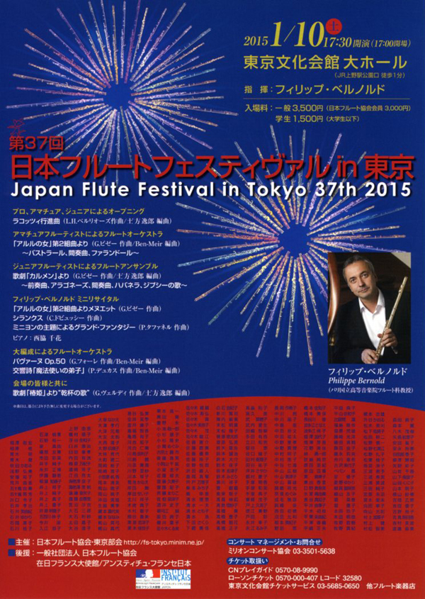 [主催] 日本フルート協会・東京部会 http://fs-tokyo.minim.ne.jp/ [後援] 一般社団法人 日本フルート協会 在日フランス大使館 アンスティチュ・フランセ日本 [チケット取扱い] CNプレイガイド TEL.0570-08-9990 ローソンチケット TEL.0570-00-0407(Lコード:32580) 東京文化会館チケットサービス TEL.03-5685-0650 他 フルート楽器店 [コンサートマネージメント] ミリオンコンサート協会 TEL.03-3501-5638 | |