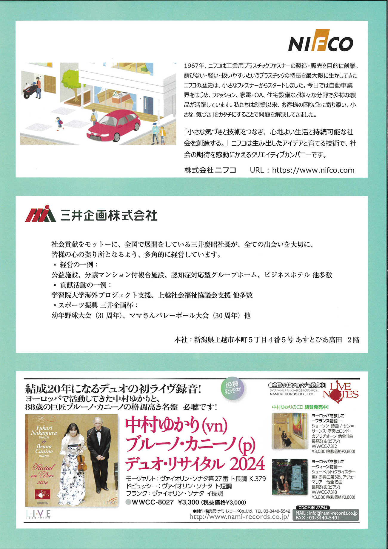 [特別協賛] 株式会社 ニフコ https://www.nifco.com/ 三井企画株式会社 [チケット取扱い] チケットぴあ https://t.pia.jp/ (Pコード 266897) ※ オンラインでのお申込みはセブンイレブンでのお引き取りとなります。 ・ お電話でのお申込み TEL.03-3501-5638 [コンサートマネージメント] ミリオンコンサート協会 TEL.03-3501-5638 | |